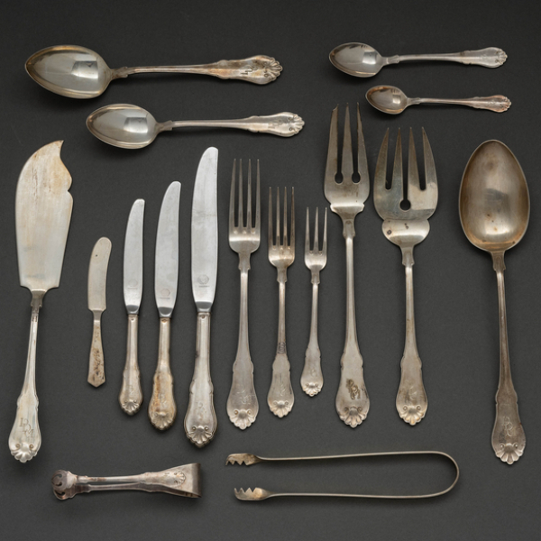 Compuesto por 12 tenedores de carne, 4 cucharas de sopa, 10 tenedores de pescado, 12 cucharillas de postre, 11 cucharillas de té, 12 tenedores de postre, 10 cucharas de pescado, 12 cuchillos de postre y 6 palas de servir.