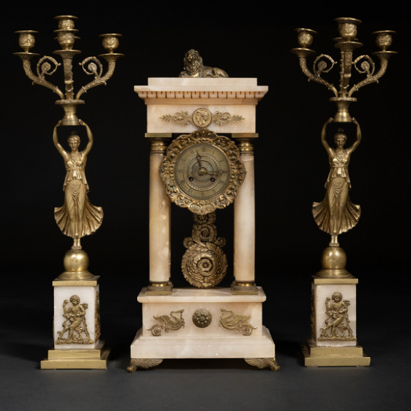 Reloj de sobremesa francés Napoleón III con guarnición de candelabros de cuatro luces en alabastro blanco y bronce dorado del siglo XIX.