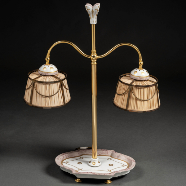 Mangani,Lámpara de mesa de dos luces en porcelana italiana simulando marmorizado y decoración en dorado con estructura en metal dorado del siglo XX.