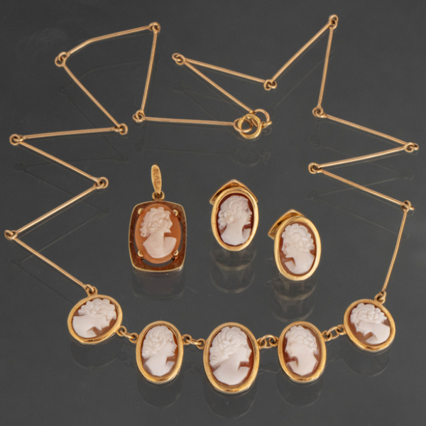 Conjunto de gargantilla, pareja de pendientes y colgante en oro amarillo de 18kt y camafeos en ágata.