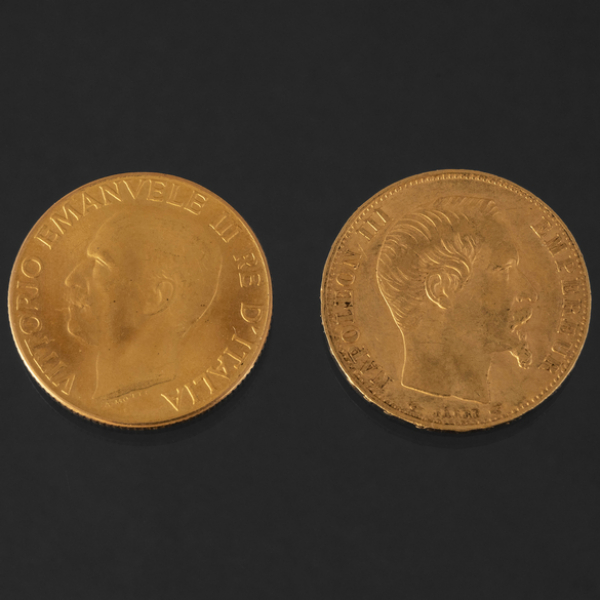 Conjunto de dos monedas de 22kt de Vittorio Emanuele III de 1923 y 20 francos de Napoleón III de 1854.