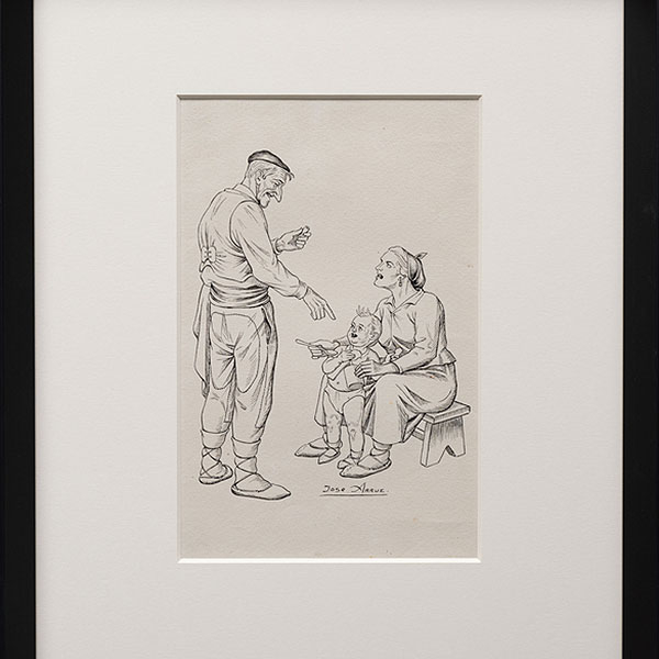 La obra que presentamos es la obra original que Jose Arrue realizó para la editorial FHER(Bilbao) propiedad de los hermanos Germán, que forma parte de un total de 10 postales que se realizaron en 1940 en blanco y negro debido a la escasez de tinta despues de la guerra para su estampación.