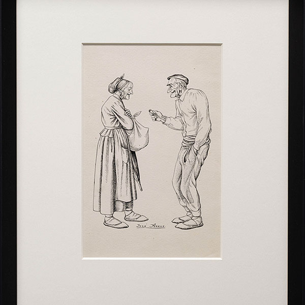 La obra que presentamos es la obra original que Jose Arrue realizó para la editorial FHER(Bilbao) propiedad de los hermanos Germán, que forma parte de un total de 10 postales que se realizaron en 1940 en blanco y negro debido a la escasez de tinta despues de la guerra para su estampación.