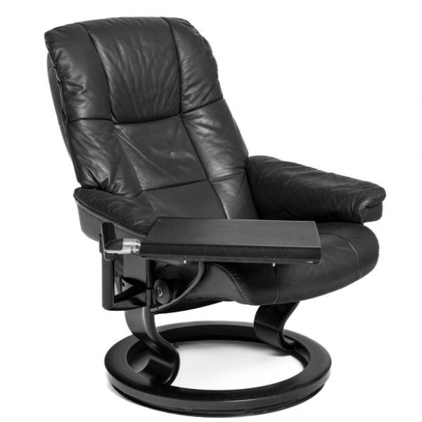 Sillón Stressless con estructura en madera de nogal y tapicería en cuero.