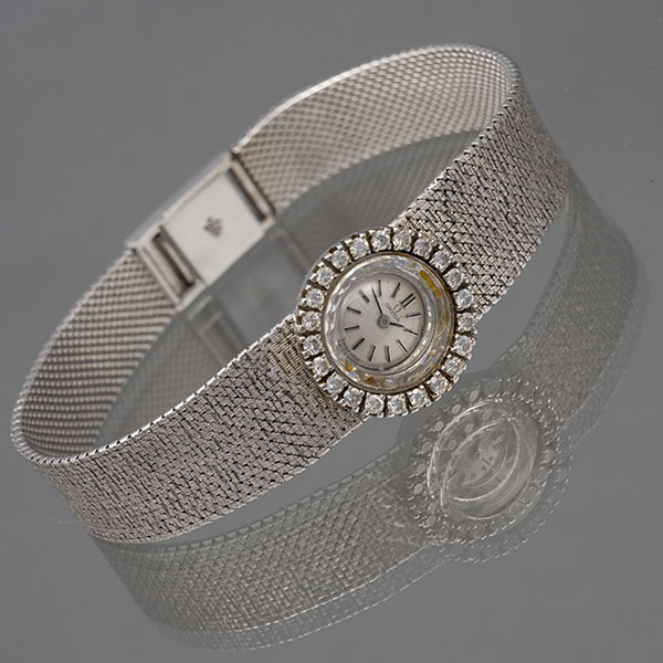 Reloj de dama marca Omega en oro blanco de 18kt orlado de brillantes.