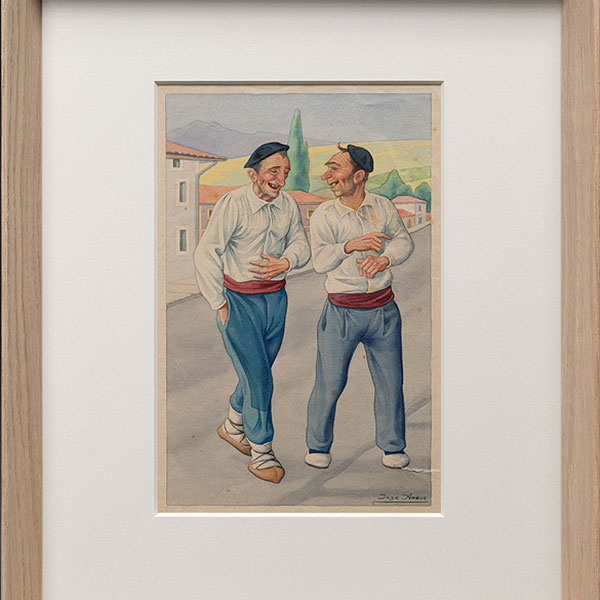 La obra que presentamos es la obra original que Jose Arrue realizó para la editorial FHER(Bilbao) propiedad de los hermanos Germán, que forma parte de un total de 10 postales que se realizaron en 1940 en blanco y negro debido a la escasez de tinta despues de la guerra para su estampación.