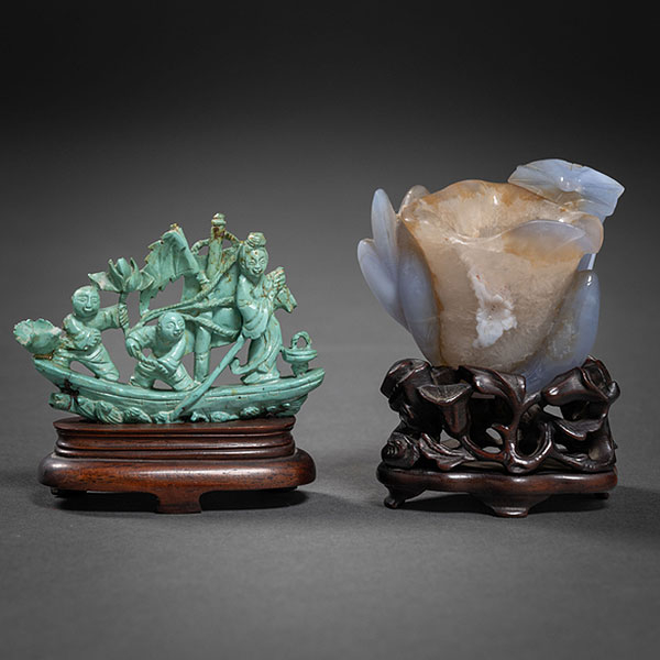 Conjunto de candelero en ágata con mariposa tallada y barca con dioses de la antigüedad en turquesa. Trabajo Chino, Finales del siglo XIX