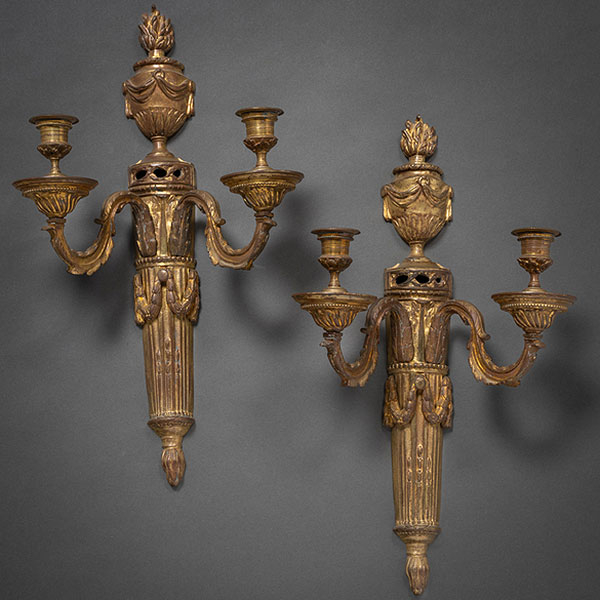 Pareja de apliques de pared de dos luces estilo Imperio en bronce dorado del siglo XIX.