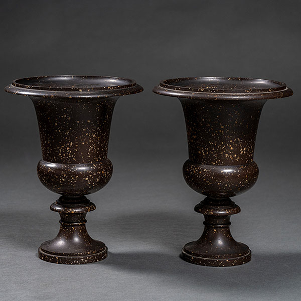 Pareja de copas neoclásicas en cerámica imitando pórfido firmado Saregremines del siglo XIX.