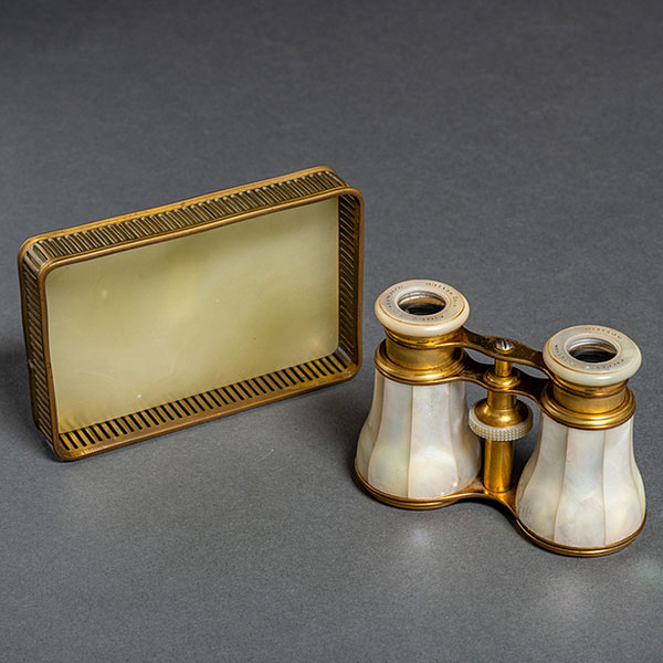 Prismáticos en bronce dorado y nácar de la marca Galpini hermanos ópticos de México y bandeja de ónix verde con barandilla calada.