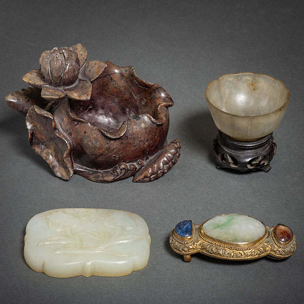 Conjunto de hebilla en bronce dorado con turquesa, venturina y jade, vaso en ágata, relieve en jade verde y flor de loto en piedra dura.