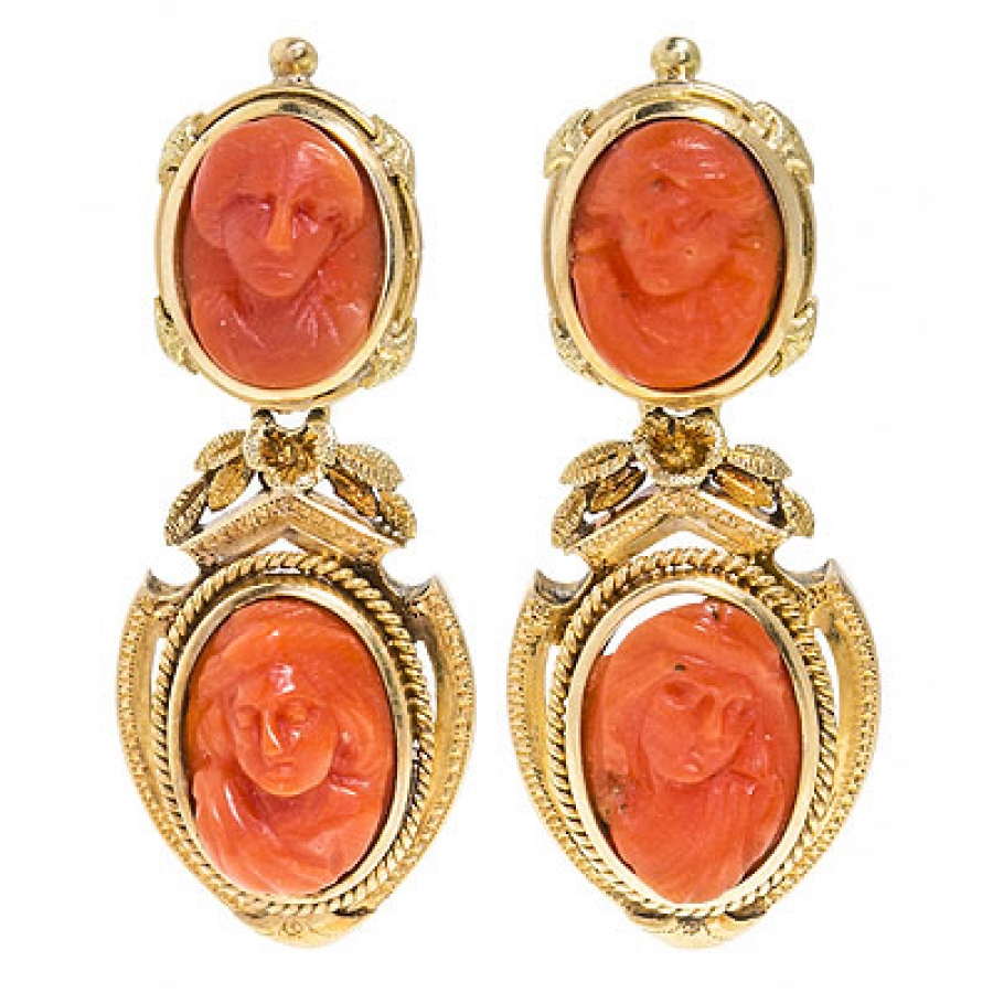 Oro y camafeos en coral tallado con la representación de bustos femeninos, 21,3x15 (broche) y 11x8,7 mm y 13x8,7 mm (pendientes). Broche: 4,1x2,9 cm. Pendientes: 4 cm. 18,9 gr