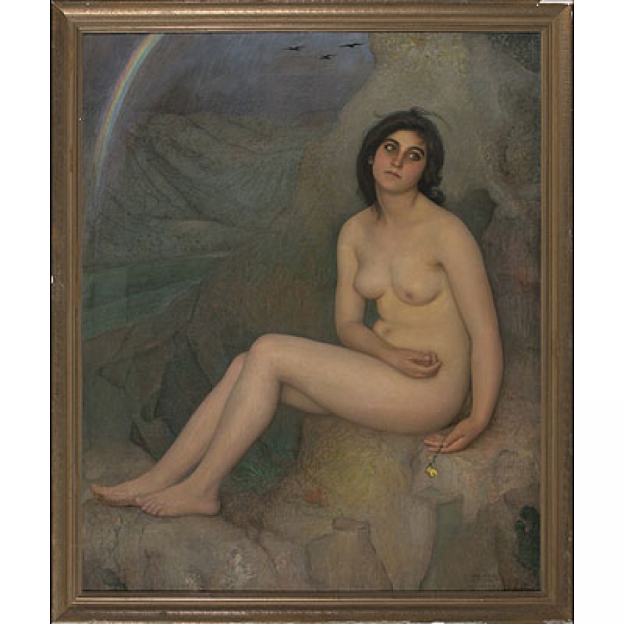 Firmado, localizado y fechado en Madrid en 1925. Exposición: "Exposición Nacional de Bellas Artes", Madrid, 1926. Bibliografía: Teresa Arce, 'Los pintores extremeños en las Exposiciones Nacionales de Bellas Artes (1924-1936)', "Norba: revista de arte", nº 6, 1985, p. 213; Lola Caparrós Masegosa, "Prerrafaelismo, Simbolismo y Decadentismo en la pintura española de fin de siglo", Granada, Universidad de Granada, 1999, p. 385-386; José Eugenio Carretero Galán, "Eugenio Hermoso 1863-1963. Visión y realidad", Punto Rojo (Edición del autor), 2014, p. 24 y 153 (reproducido). Procedencia: perteneció a la famosa colección de desnudos del Dr. Andreu, Barcelona. Según su autor y en relación a la Exposición Nacional de 1926, "en Madrid pinté también con destino a la propia Exposición, otros desnudos, firmados en la primavera de 1926 poco antes de exponerse en unión de 'Las lavanderas'. / Los desnudos fueron pintados a la vez, uno en sesión de mañana, otro de tarde. / Uno, titulado 'Madreselvas', [...]. / El otro, titulado "Inconsciencia", está inspirado en el mundo de la patología: Una joven que pierde la razón y huye al campo desnuda"