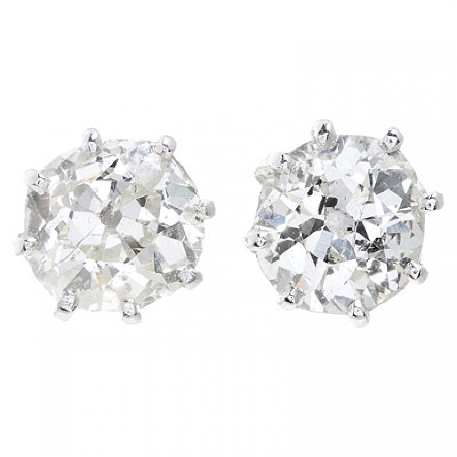 Platino, un diamante talla brillante antigua, 1,70 cts aprox, color J aprox y pureza Piqué aprox. Otro diamante talla brillante antigua, 1,63 cts aprox, color K aprox y pureza Piqué aprox. Cierres en oro blanco. 0,8 cm. 3,8 gr