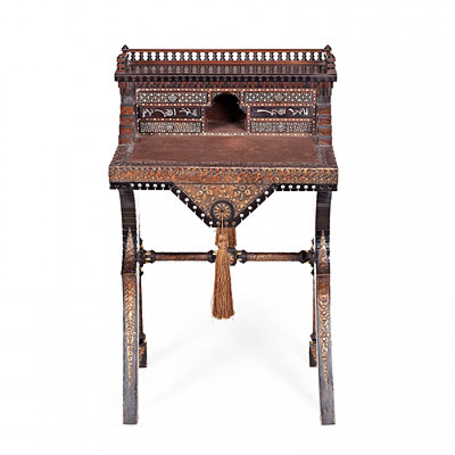 Nogal parcialmente entintado, marquetería en hueso y estaño y con aplicaciones en cobre estampadas y cinceladas. Borlas de pasamanería