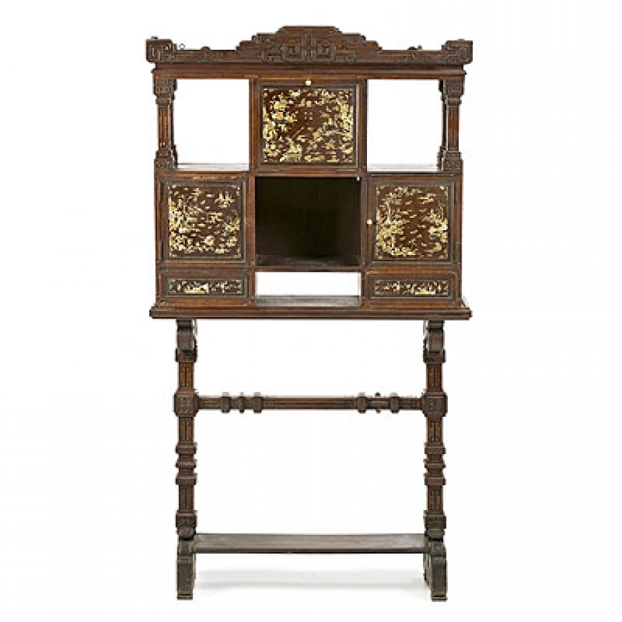 Atribuido a Francesc Vidal Jevellí Barcelona 1847 - 1914 Arquilla chinesca Nogal tallado incorporando puertas indochinas con incrustaciones de nácar de la segunda mitad del siglo XIX Bufetillo a juego79x91x26 cm arquilla y 87x92x27 cm bufetillo