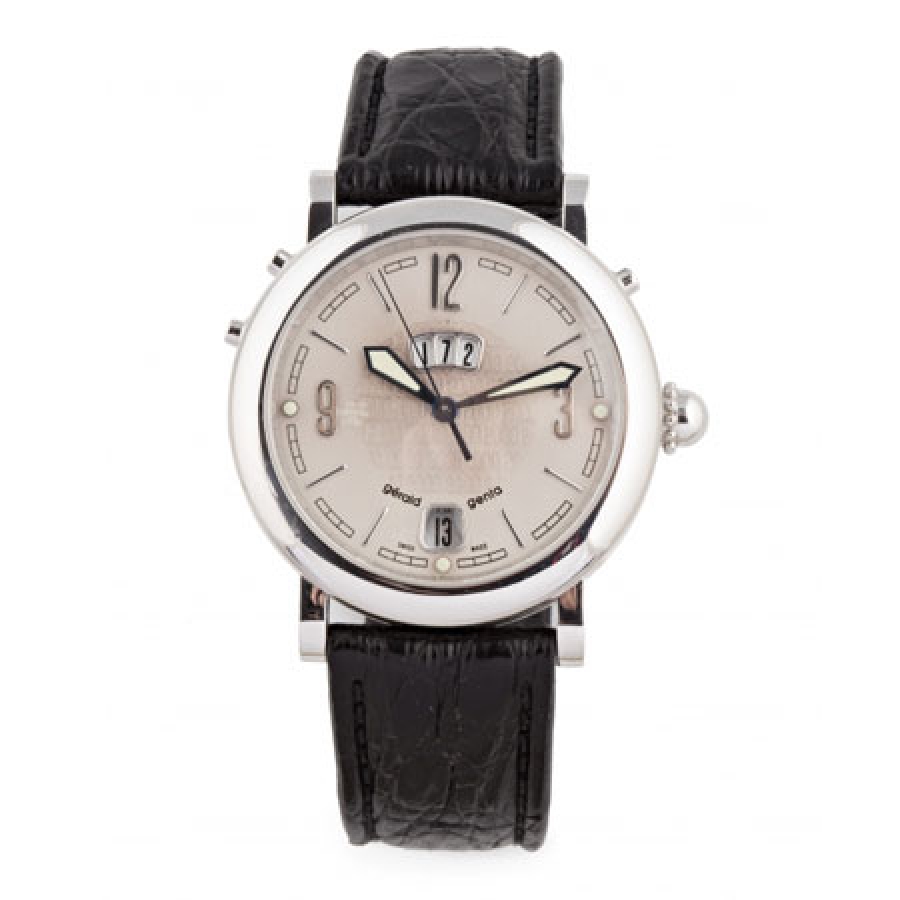 Gerald Genta, Backtimer, oro blanco de 18K Movimiento automático con triple pulsador. Esfera crema con números árabes. Calendario a las 6. Triple contador con ventana a las 12. Correa en piel no original. Cierre de hebilla original. Garantía original incluida. Año 1999. 37,5 mm