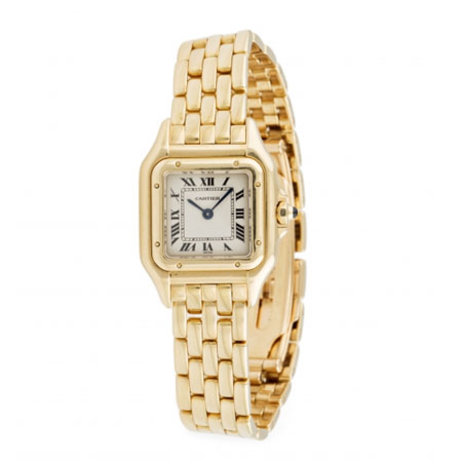 Cartier Panthere en oro amarillo 18k Movimiento de cuarzo. Esfera blanca porcelana con número romanos. Cierre deployante doble oculto. Caja original incluida con garantía expirada de 2002 de Servicio Técnico Oficial. Tamaño señora 26 mm