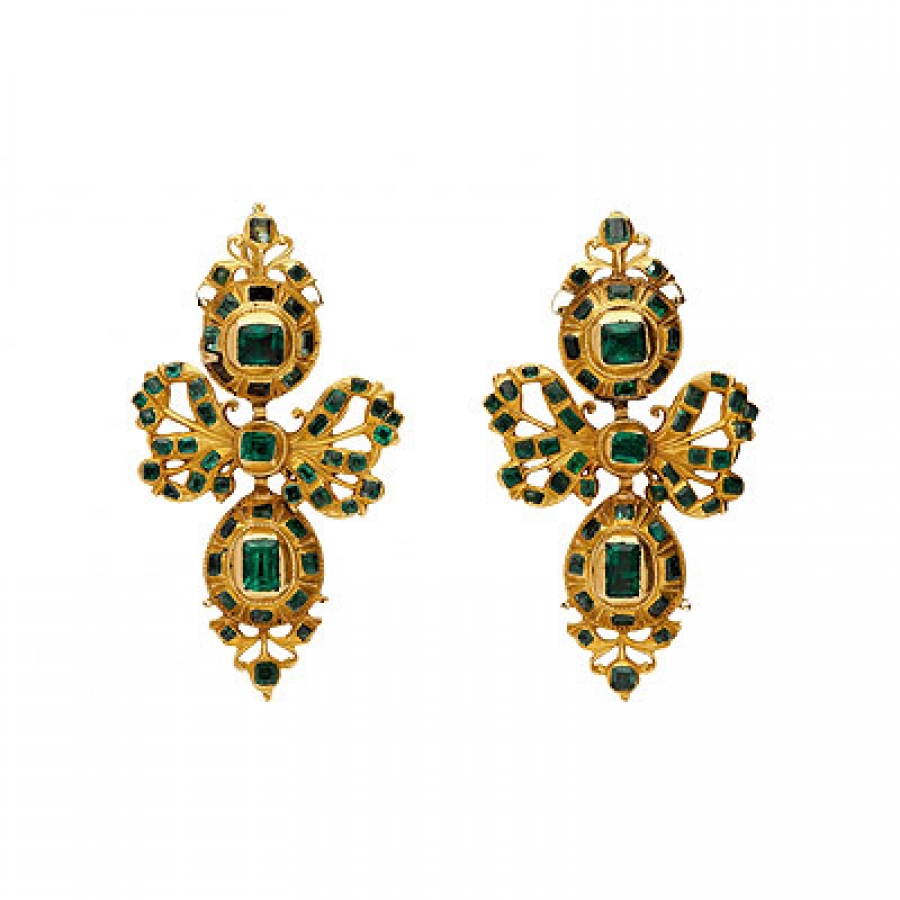 Pendientes lazo cordobeses en oro y esmeraldas, del siglo XVIII Oro y esmeraldas tallas cuadrada y rectangular, 5,55 cts. Punzonados. Falta una esmeralda. Piezas similares en el Museo Metropolitan inv. nº 1980.343.24,25. 4,4 cm. 12,6 gr