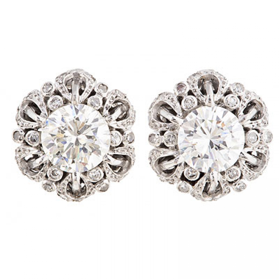 Joyería Bagués, pendientes rosetones de diamantes, hacia 1950 Platino, un diamante talla brillante, 1,45 cts aprox, color H aprox y pureza Piqué aprox y otro diamante talla brillante, 1,39 cts aprox, color H aprox y pureza SI y resto de diamantes talla brillante y 8/8, 0,55 cts. Con estuche original. 1,3 cm. 11 gr