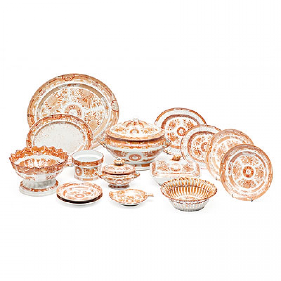 Vajilla china en porcelana de Compañía de Indias con decoración naranja "orange Fitzhugh" para el exportación al mercado estadounidense, hacia 1800-1820 Consta de 2 soperas, 12 platos hondos, 31 platos llanos, 2 tarros, pequeña bandeja, fuente rectangular con tapa, 7 tapas, bandeja ovalada menor, bandeja ovalada grande, 2 fruteros-refrescadores, 6 cuencos en forma de hoja, 22 platos de postre hondos, 4 platos de postre llanos, fuente ovalada con decoración perforada pequeña y otra mediana. Total 94 piezas. Desperfectos27x36x27 cm sopera mayor