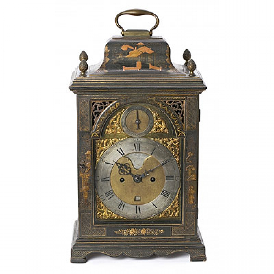 Reloj de sobremesa "bracket" inglés en madera lacada con "chinoiseries", de finales del siglo XVIII Relojero James Smith de Londres. Mecanismo de escape de paletas. Sonería de horas y medias, selector de sonería o silencio. Calendario. En estado de marcha. Aplicaciones en bronce dorado 46x27x18 cm