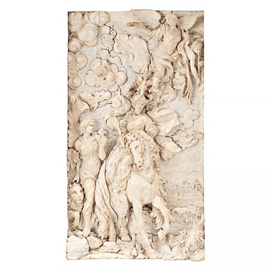 Escuela alemana hacia 1870 El Triunfo de María de Medici en Juliers Placa en marfil tallado en altorrelieve Marco en madera. Siguiendo modelos la pintura de Peter Paul Rubens pintada hacia 1622 y que formaba parte del ciclo de María de Medicis con destino el Palacio de Luxemburgo de París y actualmente conservadas en el Museo del Louvre, de la misma ciudad 37x21 cm placa y 51x35 cm marco