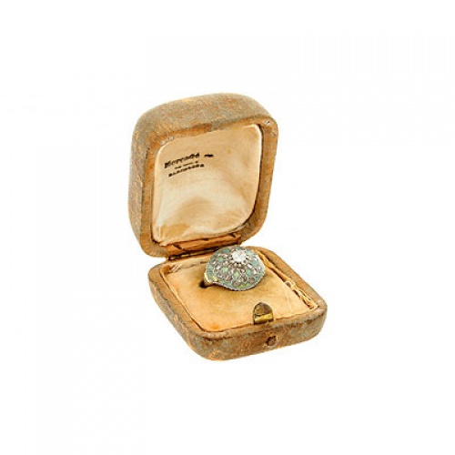 Jaume Mercadé Queralt Valls 1889 - Barcelona 1967 Sortija bombée de esmalte y diamantes, hacia 1930 Oro de 14K con vistas en platino, esmalte basse taille y diamantes tallas brillante antigua y rosa, 0,86 cts. Con estuche original. 5,2 gr