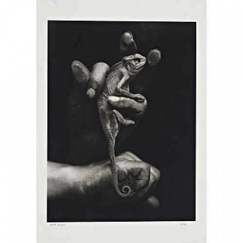 Montse Campins Barcelona 1955 Camaleón en manos de una mujer Fotografía Firmada, numerada 10/10 y con marca de aguas con el monograma de la artista. En el reverso, la tarjeta de invitación de la exposición en la que participó, "La vitrina del fotògraf. Montse Campins", Palau Robert, Barcelona, 9 abril - 15 mayo 2003 49x34 cm
