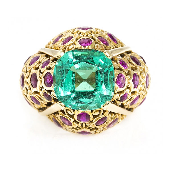 Joyería Cartier, sortija con esmeralda central y rubíes *