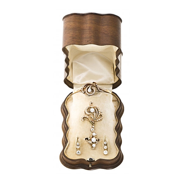 Compuesto por pulsera, broche, sortija y pendientes. Pulsera en oro rosa y diamantes talla brillante antigua, 1,70 cts. Broche en oro rosa, diamante central talla brillante antigua, 1,27 cts aprox, color L aprox y pureza Piqué aprox, y resto de diamantes talla brillante antigua, 1,95 cts. 4,7x3,4 cm. Sortija en oro rosa, un diamante talla brillante antigua, 1,30 cts aprox, color J-K aprox y pureza VS2-SI aprox, y resto de diamantes talla brillante antigua, 1,65 cts. Pendientes en oro rosa, un diamante talla brillante antigua, 0,95 cts aprox, color L-M aprox y pureza SI aprox, otro diamante talla brillante antigua, 1 ct aprox, color L-M aprox y pureza SI - Piqué aprox y resto de diamantes talla brillante antigua, 1,55 cts. 2 cm. Con estuche original en madera y con las iniciales CP en oro. 39,8 gr