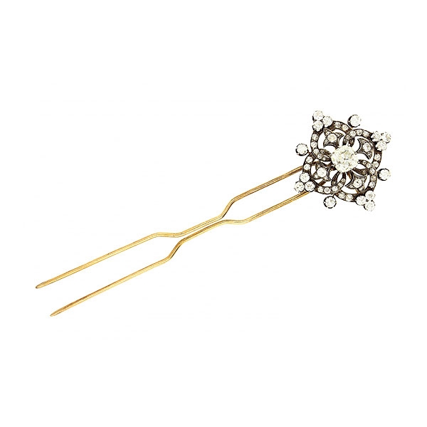 Oro con vistas en plata, diamante central talla cojín antigua, 3,35 cts aprox, color N+ aprox y pureza VS aprox y resto de diamantes talla brillante antigua, 4,14 cts. Punzonado. Se adjunta aplique en oro para transformar el broche en un prendido para el pelo. 4x4,2 cm. 15,4 gr