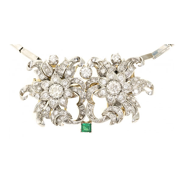 Platino, diamantes talla brillante antigua y 8/8, 3,80 cts y esmeralda talla fantasía, 0,44 cts. Cierres en oro amarillo y gargantilla en oro y oro blanco. 3,8x7 cm. 46,9 gr