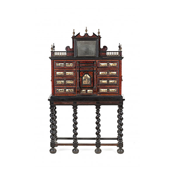 Escritorio flamenco en ébano, palisandro, madera ebonizada y carey, con placas de alabastro pintado con escenas paisajísticas con arquitecturas, de finales del siglo XVII - principios del siglo XVIII