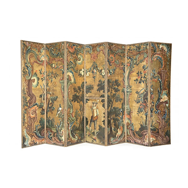 Gran biombo de siete hojas en guadamecí de piel dorada en corladura y pintada, del siglo XVIII y montado a finales del siglo XIX.