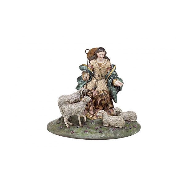 Escultura en terracota policromada, dorada y estofada, con soporte de madera.