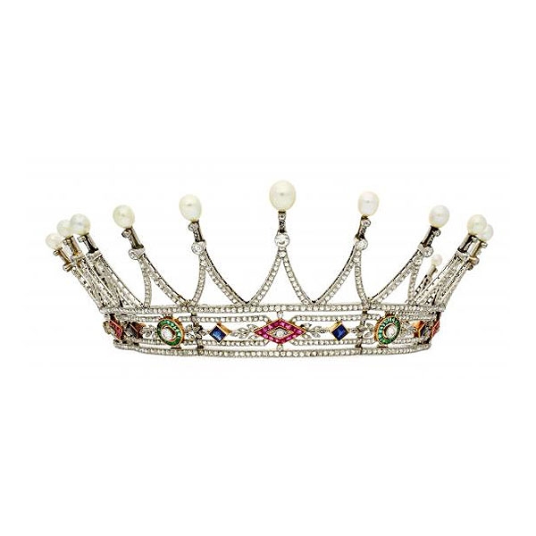 Platino con vistas en oro, diamantes talla brillante antigua y rosa, 14,85 cts, perlas aperadas probablemente finas en disminución de 5,5 a 8,5 mm, zafiros talla cuadrada, 2,66 cts, esmeraldas talla cuadrada y rectangular, 1,65 cts y rubíes talla cuadrada y trapecio, 1,85 cts. Dos perlas se desenroscan para montarse en pendientes colgantes de época realizados en oro con vistas en platino y diamantes talla antigua y rosa, 0,60 cts.