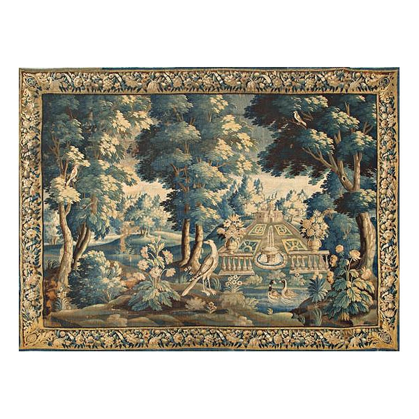 "Paisaje con palacete", tapiz francés "verdure" en lana de Aubusson, de finales del siglo XVII-primera mitad del siglo XVIII