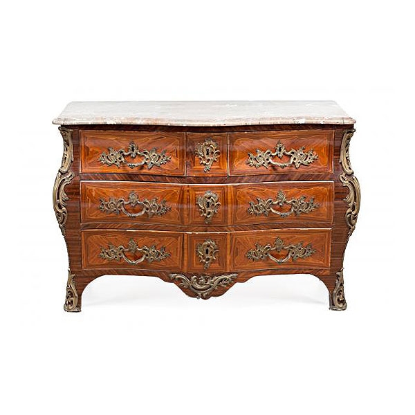Palo rosa y palo violeta con fileteados en satín. Bronce dorado y mármol gris de Sainte Anne