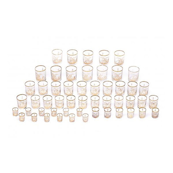 Tamaños en gradación. Consta de 12 de agua, 10 de vino tinto, 12 de vino blanco, 6 de jerez y 12 de licor, total 52 piezas.