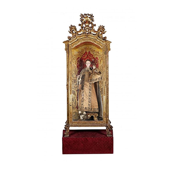 Vitrina-escaparata de la misma época en madera tallada y dorada, con decoración pintada, dorada en corladura y al oro fino en el interior