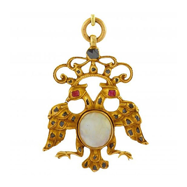 Oro, ópalo talla cabujón oval 0,95 cts, rubíes talla rectangular, 0,04 cts y diamantes talla rosa, 0,18 cts.