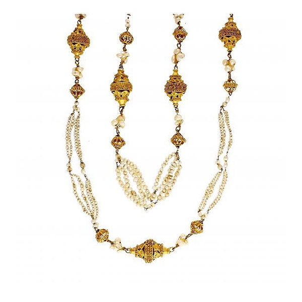 Collar formado por dobles hileras de sartas de perlas probablemente naturales de 2,2 a 5,3 mm diám alternadas por entrepiezas de oro en filigrana.