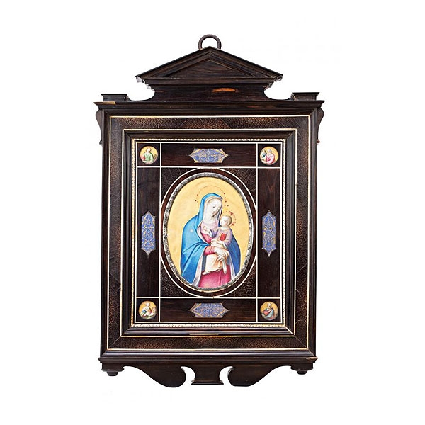 Medidas: 49x33,5x4,7 cm (conjunto), 16x12 cm (Virgen con el Niño), 2,7 cm diámetro (Evangelistas) y 7x2 cm (medallones).