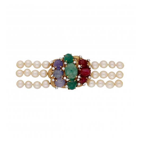 Rubíes talla cabujón, 11,36 cts, zafiros talla cabujón, 14,38 cts y diamantes talla brillante, 0,90 cts. Firmada: "18K WEBB".