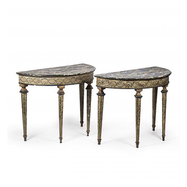 Pareja de consolas italianas de media luna de estilo neoclásico en madera policromada con decoración de guirnaldas y tapas marmorizadas, de finales del siglo XIX
