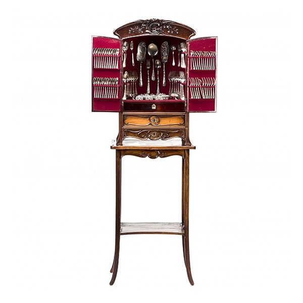 Cubertería de doce servicios barcelonesa Modernista en plata con mueble cubertero original en caoba, hacia 1905-1910