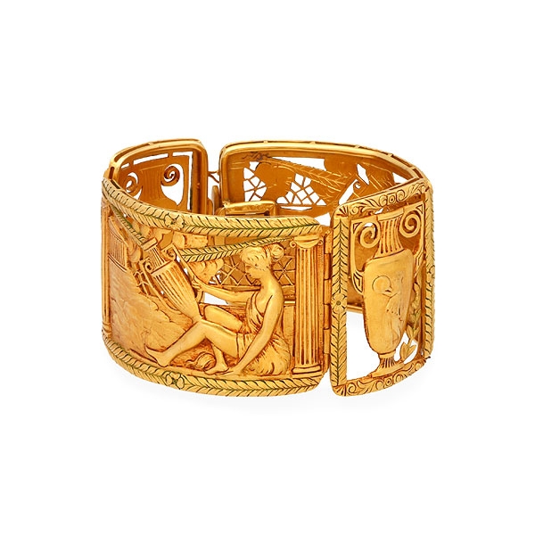 Pulsera novecentista en oro, hacia 1922Oro cincelado con la representación de escenas de la Grecia clásica.