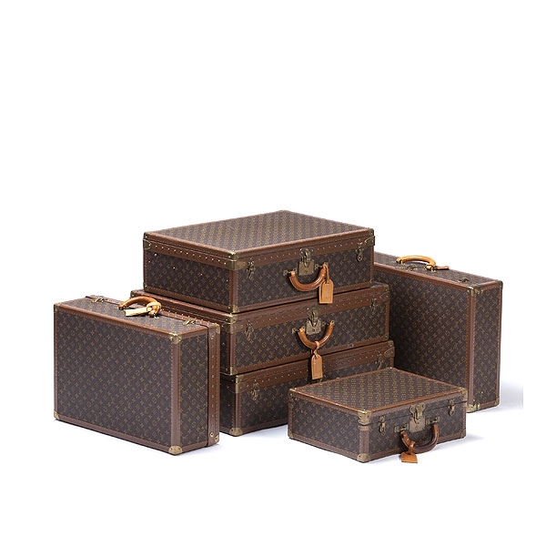 Juego de seis maletas en lona "monogramme" y piel, del tercer cuarto del siglo XX