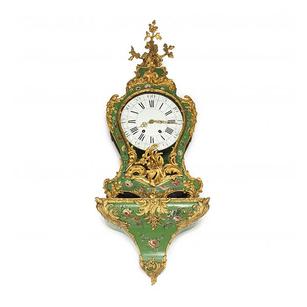 Reloj de ménsula francés Luis XV en madera policromada y bronce dorado, del segundo tercio del siglo XVIII
